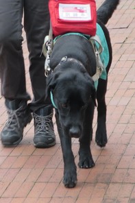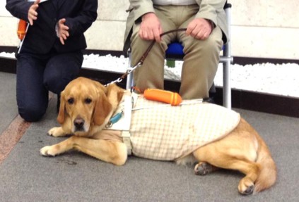 左の写真は「ゲート」というお仕事です。人を改札に誘導するというものです。1次試験(TP1)が終わると、電車に乗る訓練も行います。エリンはこれから電車訓練を行う予定です。2015年3月、エリンちゃんが盲導犬デビューしたと連絡がありました。