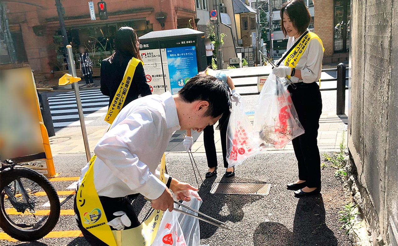 港区が主催する「赤坂青山 美しいまち マナーのまち」キャンペーンでは、赤坂・青山地域において、「みなとタバコルールの周知・徹底、ゴミのポイ捨て禁止、放置自転車・バイクの禁止」を図るため、地下鉄駅周辺で定期的に「赤坂青山 美しいまち マナーのまち」キャンペーンを実施しています。