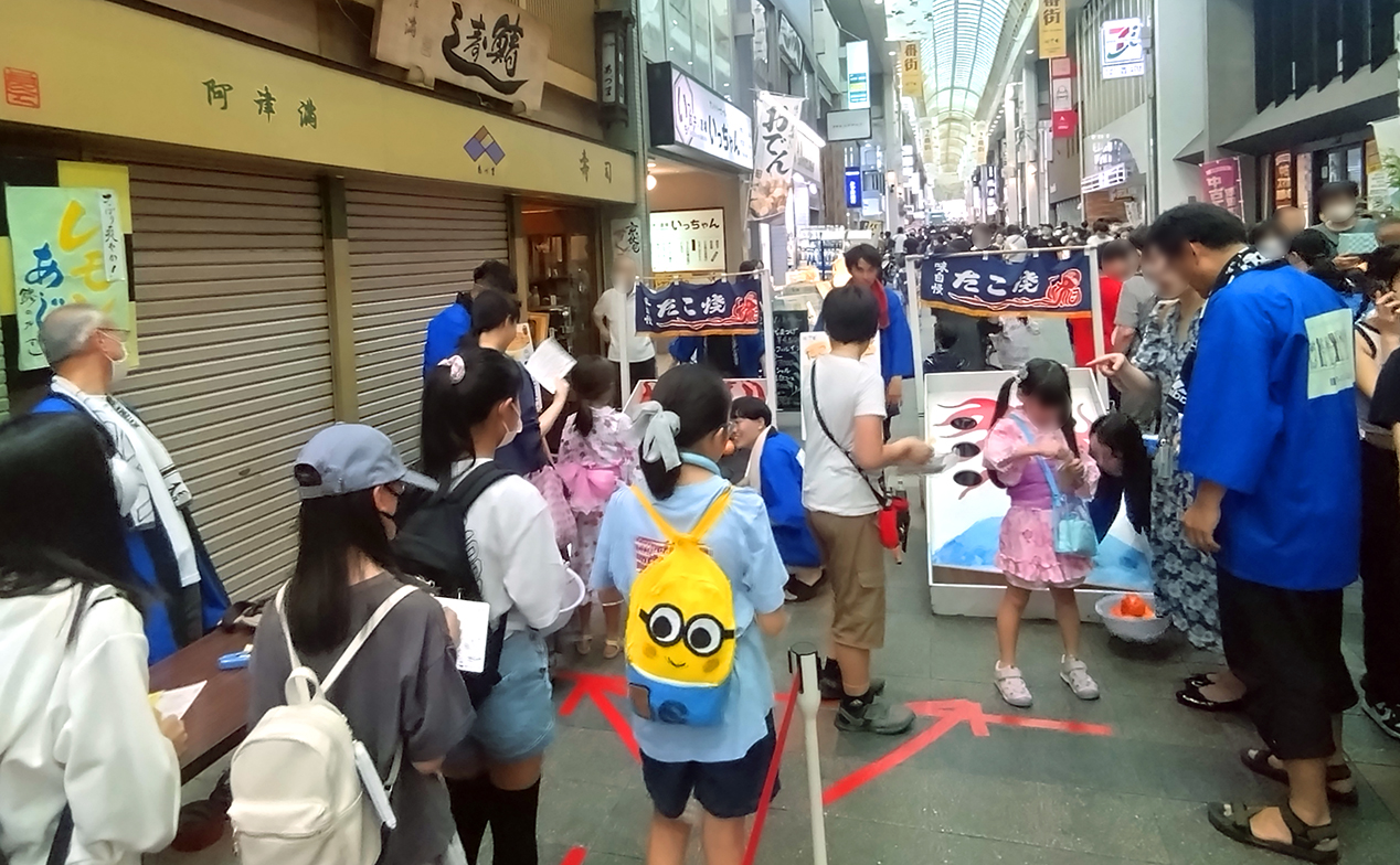 毎年7月の下旬に開催される「夏の夜市」は、伏見支店のある伏見大手筋商店街をはじめ、風呂屋町商店街、納屋町商店街、油掛商店会、竜馬通り商店街、中書島柳町繁栄会、中書島繁栄会からなる「がんばる伏見7商店街」が合同で行っている夏の恒例イベントです。今年も商店街には、オリジナルのゲームコーナーや屋台が立ち並び、子どもから大人まで多くの笑顔で賑わいました(7/26)。