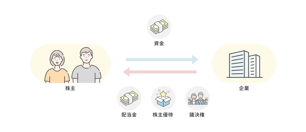 金融機関などからの借り入れとは異なり、企業に株主への返済の義務はありません。株主はリスクを負う代わりに、保有株式の割合に応じた配当金や株主優待を受け取る権利を得るほか、経営に対して意見を言うこともできます(議決権)。