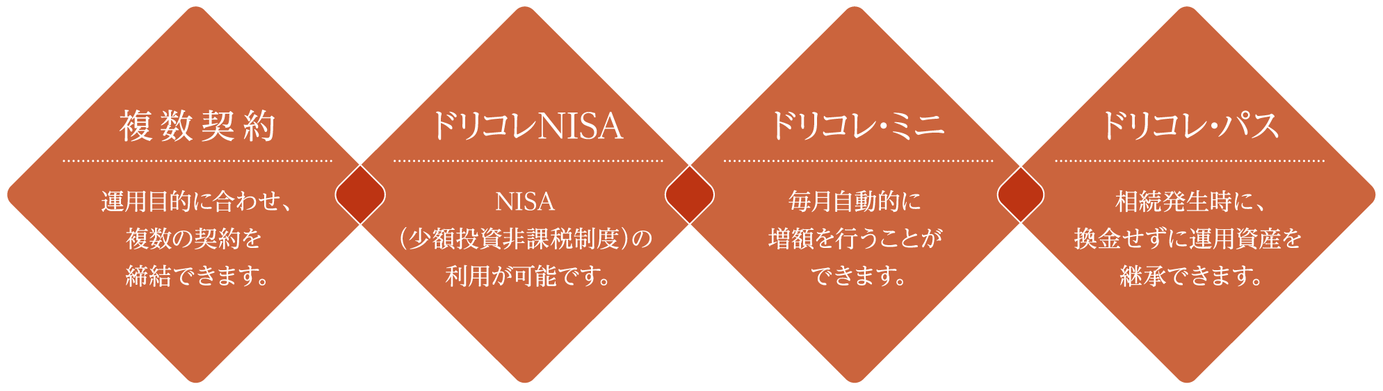 いちよしファンドラップ「ドリーム・コレクション」のご契約にあたっては、「いちよしファンドラップ投資一任契約」を締結する必要があります。「いちよしファンドラップ投資一任契約」は、いちよし証券株式会社(以下「当社」といいます)がお客様より投資判断のすべてを一任され、当社の投資判断に基づき投資を行う権限を委託いただく契約です。当社は、「いちよしファンドラップ投資一任契約」に基づき資産配分の構築や投資信託等の投資判断、売買の注文執行、定期的な報告などのサービスを提供します。ご契約にあたっては、当社よりお渡しする提案書、契約締結前交付書面、いちよしファンドラップ投資一任契約約款、いちよしファンドラップ口座約款等の内容を必ずご確認ください。また、お申し込みの際は、最新の投資信託説明書(交付目論見書)をご熟読ください。なお、いちよしファンドラップ投資一任契約は、クーリング・オフの対象にはなりませんのでご留意ください。ご利用にあたっては、ご提供するサービスや運用・管理に係る料金として、投資顧問報酬と口座管理料をお支払いただきます。料率はご契約いただく運用モデルによって異なりますが、固定報酬制の投資顧問報酬は運用資産の年率0.3960%~0.7040%(税込)、実績報酬併用制の投資顧問報酬は運用資産の年率0.1386%~0.2464%(税込)+運用益の11.0%(税込)となります。口座管理料は年率0.8800%~1.3200%(税込)となります。また、ご契約金額によっても料率は異なります。組入投資信託では信託報酬、その他費用(監査費用等)をご負担いただきます。その他費用(監査費用等)は運用状況等により変動するため、事前に上限等をお示しすることはできません。詳しくは各投資信託説明書(交付目論見書)にてご確認ください。※ 消費税率は10%として計算しています。税制等の変更により、適用税率 の変更があった場合は、変更後の税率によります。