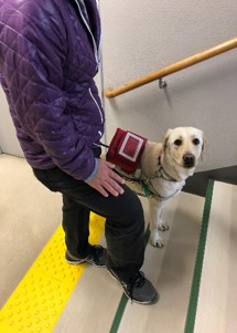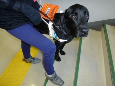 左の写真は「ゲート」というお仕事です。人を改札に誘導するというものです。1次試験(TP1)が終わると、電車に乗る訓練も行います。エリンはこれから電車訓練を行う予定です。2015年3月、エリンちゃんが盲導犬デビューしたと連絡がありました。