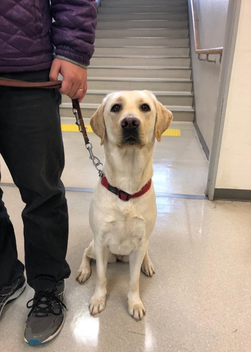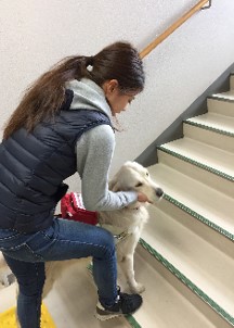 パートナーとなるユーザーとの共同訓練では、初日からお腹を出してリラックスできており、ユーザーの話を一生懸命に聞いて、褒められると尻尾を“ブンブン”と振って楽しそうに訓練に臨んでいました。盲導犬の基本動作はもちろんのこと、初めて行く場所でもドアや椅子を見つけて自信満々に作業をしていました。