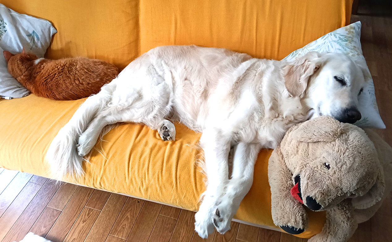 盲導犬としてユーザーさんの歩行を支えてきたベリーですが、引退後の現在はボランティアさんのご家庭で、元気にのんびりとした日々を過ごしています。