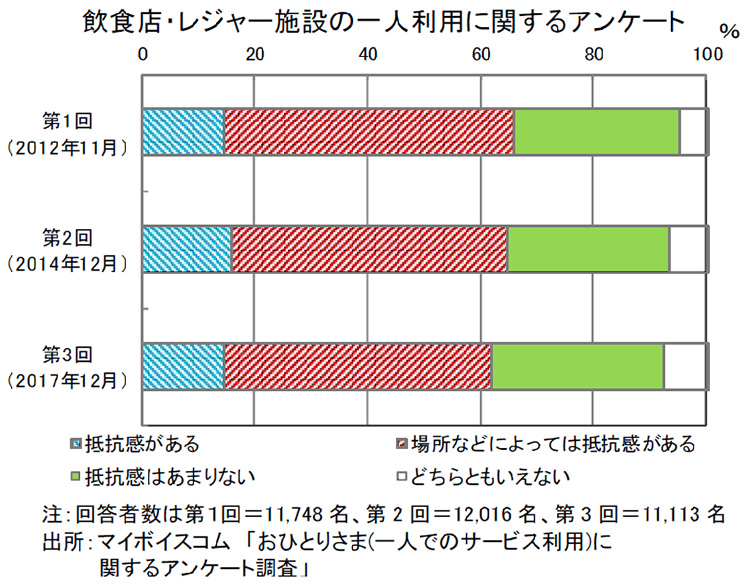 神様:一人でのサービス利用に関するアンケートを見ると、一人で飲食店やレジャー施設に足を運ぶことに「抵抗感がある」「場所などによっては抵抗がある」と答えた人はまだ6割程度と過半数ですが年々減少しており、一方「抵抗がない」「どちらともいえない」と答える人は年々増えています。