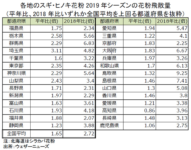 T:気象情報会社のウェザーニューズによれば、花粉飛散量の全国平均は、平年比1.6倍、2018年比2.7倍と予想している。東日本を中心に6年ぶりの大量飛散となる恐れがあるそうだよ。