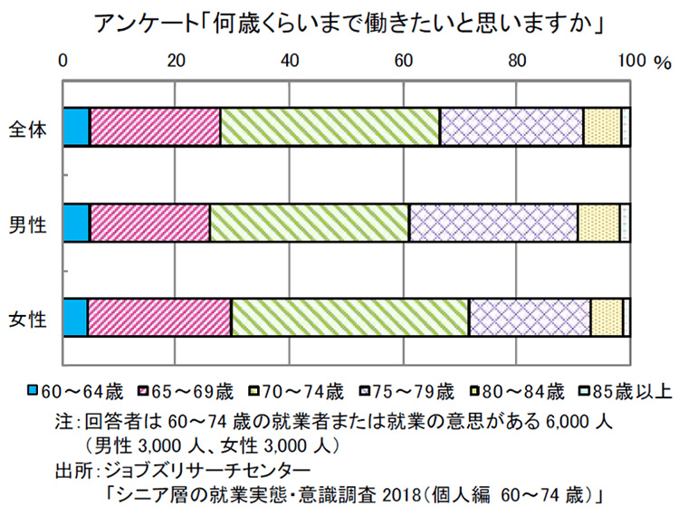 T:それもあるけど、就業率も上昇していて、働く意欲が高まっていると考えられるよ。シニアの働く意欲に関するアンケート調査を見てみると、定年を迎えた後も長い期間の就業を希望していることがわかる。特に男性は70代になっても働くことを考えている人が多いようだ。
