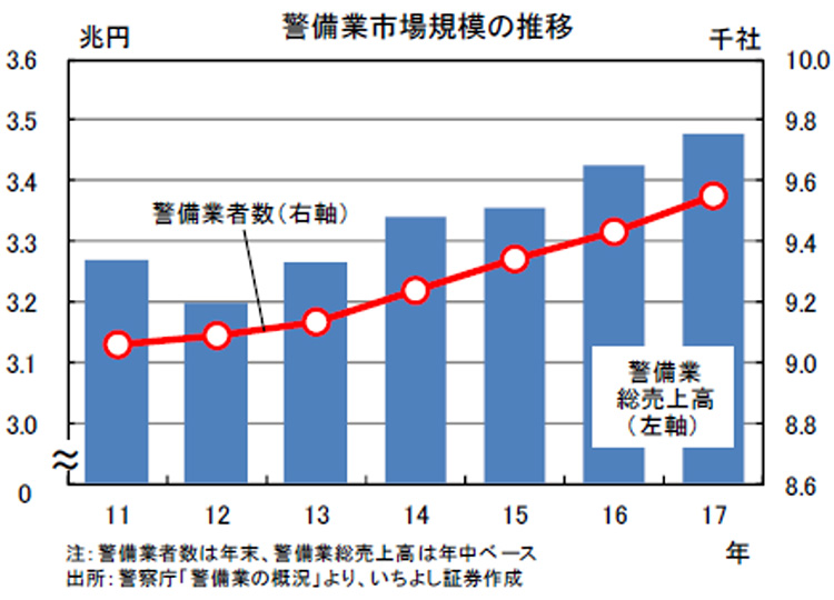 T:機械警備は比較的大規模な設備投資と一定水準以上の事業規模が求められ、参入障壁が高いとみられるからね。先行した会社が有利と言えそうだね。一方で、セキュリティ事業を中核に、綜合管理・防災事業、介護事業といった周辺領域もビジネス展開の可能性がある。