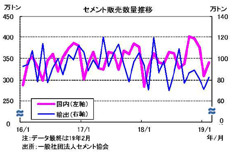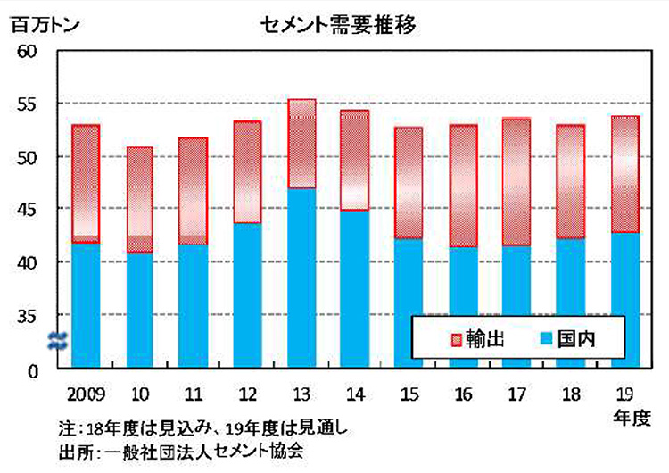 T:日本のセメントは、その品質や製造技術・環境技術の高さ、産業廃棄物の有効活用等で世界から認知されているようだ。セメント協会によれば、19年度(19年4月〜20年3月)のセメント需要見通しは、国内は前年度見込み比1.2%増の4,300万トン。海外は、同3.8%増の1,100万トンの見込み。海外は、アジアだけでなく、オセアニア等の地域でも伸びが期待されるそうだ。量は国内が大きいけど、伸びは海外向けが大きいようだね。