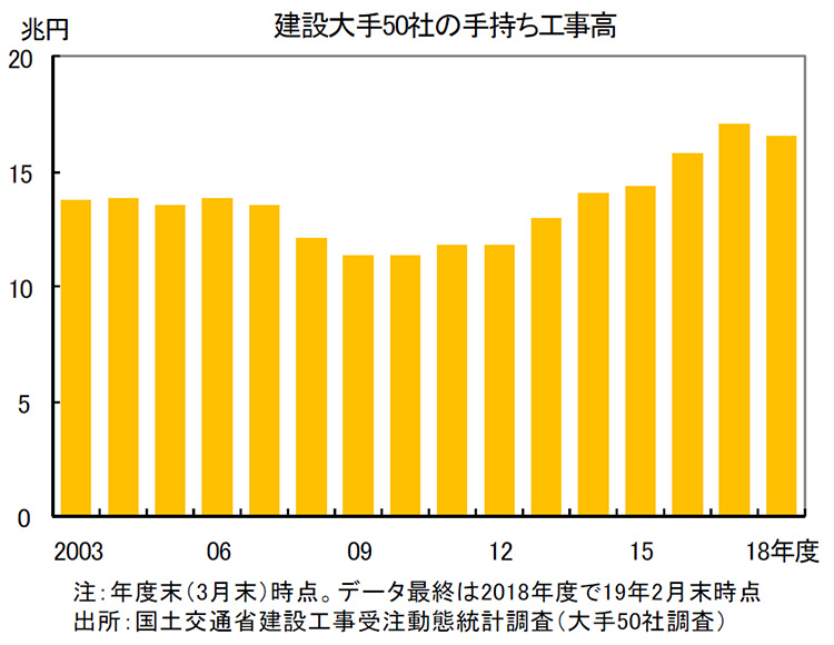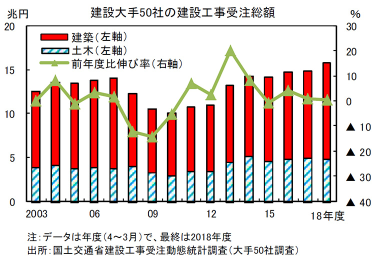 T:わかるよ。だから受注高という今後の仕事をどれだけ獲得したかという指標を見ると良いのだけれど、国土交通省によると、2018年度(4〜3月)の建設大手50社の建設工事受注総額は前年度比6.5%増の15兆8,590億円と、3年連続で増加したんだ。