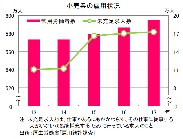 T:小売業の雇用状況を見ると、常用労働者数、つまり毎日のように働く人は増えている。でも、充足されていない求人数も増えてしまっている。つまり、小売業の店舗等の仕事は人が増える以上に増えている状況と言える。だから、確かに仕事は見つけやすいだろうね。