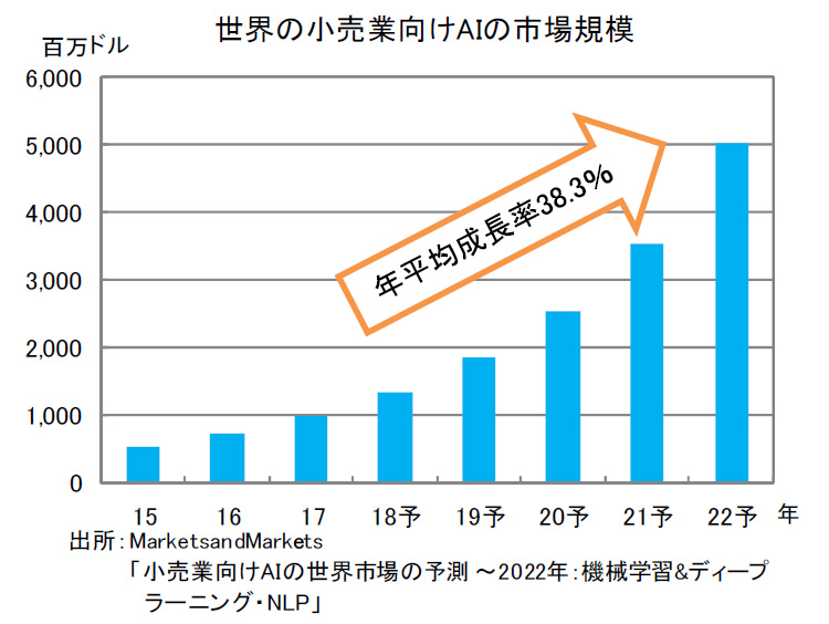 T:その通り。省人化効果の高い技術の1つがAI(人工知能)だ。AIによる無人レジの稼動や管理業務の自動化が省人化につながる。画像認識など先進テクノロジーを活用し、無人決済店舗も増えるだろうね。世界では小売業向けのAI市場規模は2017年の9億9,360万ドルから、2022年には50億3,400万ドルに成長すると予測されているそうだ。(MarketsandMarketsの調査)