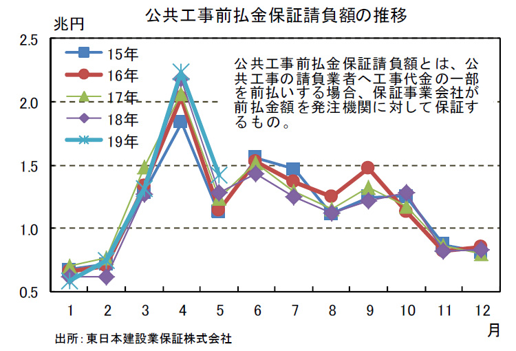 神様:そうですね。公共工事の発注動向の把握には、全国における「公共工事前払金保証請負額」が用いられますが、その推移を見ると、2019年の1月から5月は6.3兆円と、前年同期比で5.7%も増加しています。2018年後半にかけて、災害復旧や防災対策工事が増加したことが、2019年前半の公共工事を牽引していると言えます。