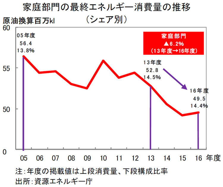 神様:また、電力などのエネルギーが企業、車や家庭などで実際に使用されたエネルギー量のことを「最終エネルギー消費量」といいます。2016年度では、家庭では2013年度に比べて6.2%減少しており、家庭での最終エネルギー消費量は年々減少しています。