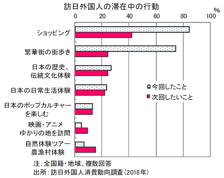 神様:訪日外国人観光客の消費動向調査を見てみると、訪日外国人観光客数が増加しているのもありますが、1人当たりの消費額が増え、娯楽やサービスへの消費志向が高まっていることがわかります。また、滞在中の行動を見ると、モノの消費がメインではありますが、次回の訪日時にしたいこととして、日本の伝統文化体験や日常生活体験などへの希望が多く、「体験」が存在感を高めていることがわかります。消費トレンドで言えば、「モノ消費」から「コト消費」へ変化しているのです。