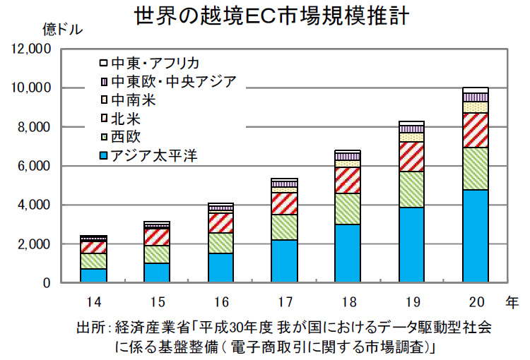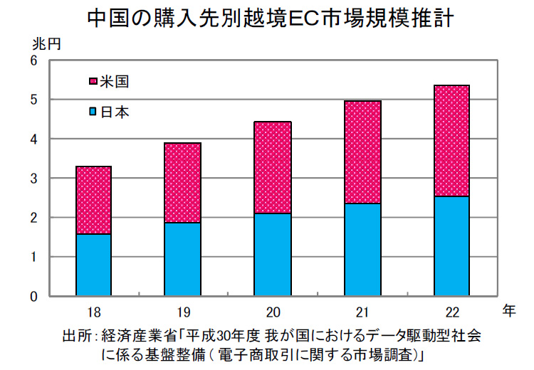 神様:はい。今後もその流れが続くと見られています。経済産業省によると、中国の購入先別越境EC市場規模は、日本と米国で2018年で3兆円超、2020年には4兆円を超えると推計されています。日本だけで見ても、米国と同等規模で成長を続けていくと見込まれています。