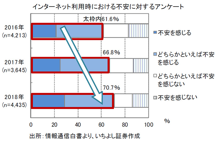 神様:そういう仮説を持って考えることが大切ですね。5年間で大きく変わった状況は何か、どのように変化したのか?そこにヒントがあると思います。ひとつ言えるのは、働き方改革が影響していることは確かであると思います。また、実際にインターネット利用時における不安についての調査では、「不安を感じる」または「どちらかといえば不安を感じる」と回答した人が、2016年から2018年にかけて右肩上がりで増加する傾向にある、という結果もありますから、セキュリティへの意識も高まっているかもしれません。他に、学校教育でも大きな変化がありませんか?