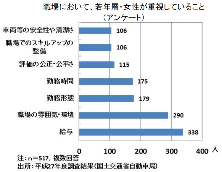 T:国土交通省による「若者や女性が職場において重視していること」の調査によれば、1番重視されるのは「給料」で、その次に「職場の雰囲気や環境」、それから「勤務形態」や「勤務時間」。給料が安い、勤務環境が厳しいトラック運転手はどうしても敬遠されてしまうよね。