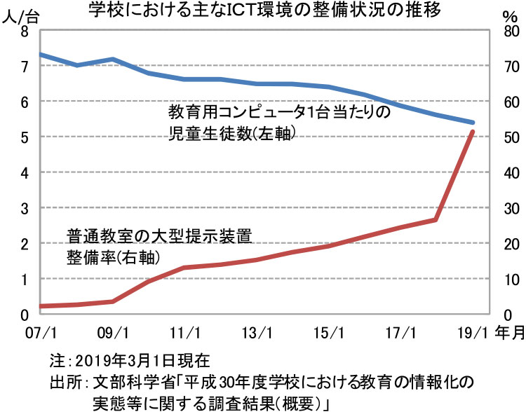 T:まず、新学習指導要領は、小学校が2020年度、中学校は2021年度、高等学校は2022年度の実施予定です。小学校でのプログラミング教育の必修化、理数教育の充実などを盛り込み、そのためのICT環境の整備として、学習者用コンピュータを3クラスに1クラス分程度整備すること、大型提示装置・実物投影機を100%整備すること、そして超高速インターネットや無線LANを100%整備することなどの目標水準を定めており、ゆくゆくは児童生徒が1人1台パソコンを使えるように準備を進めています。それを受けての発言だと思いますが。