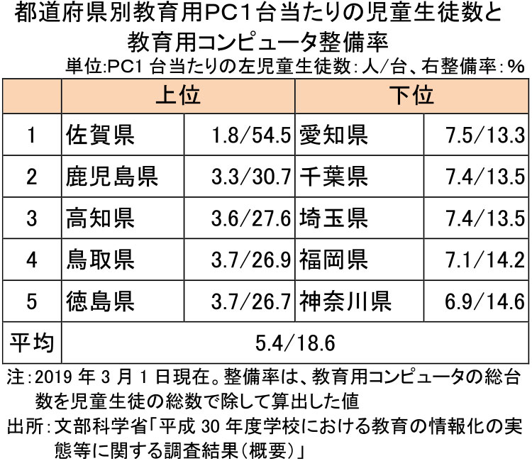 神様:その通りですね。問題なのは、自治体によって「やる気」に差があり、ICT整備の進捗に地域差が出ていることです。文部科学省が調査した「都道府県別教育用PC1台当たりの児童生徒数と教育用コンピュータ整備率」によれば、最も環境の整備が進んでいるのは佐賀県で、パソコン1台当たりの児童・生徒数は1.8人です。その後、鹿児島、高知と続いていますが、パソコン1台当たりの児童・生徒数は3人を上回っています。下位の県になると、神奈川県ではパソコン1台当たりの児童・生徒数は6.9人と、1台のパソコンを7人で使う計算です。