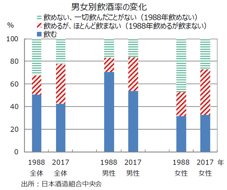 神様:1988年(昭和63年)と2017年(平成29年)の男女の飲酒率の変化を見ると、男性は「飲む」人が減っているのですが、女性は「飲む」人がわずかに増加し、「飲めるが、ほとんど飲まない」人が大幅に増えていることがわかります。