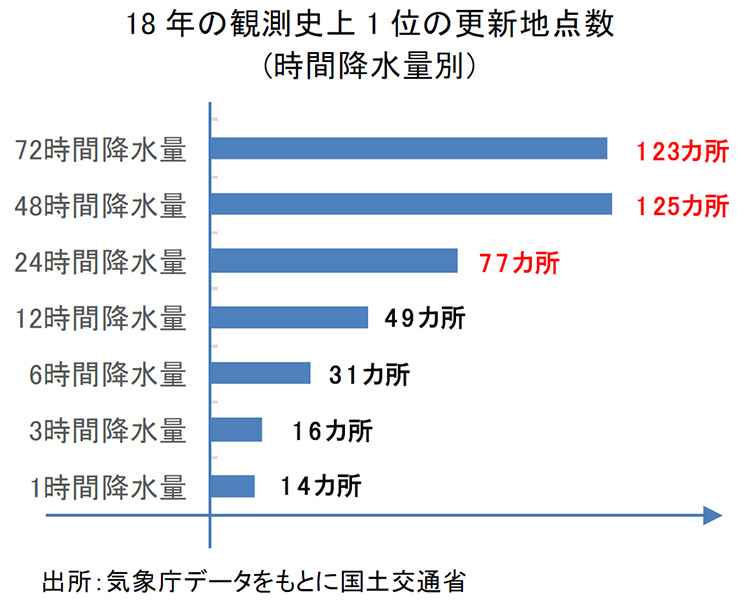 神様:また、大雨が長時間降り続くことで、豪雨災害となりますが、2018年に国内約1,300拠点に点在するアメダス観測所等では、24時間降水量が77か所、 48時間降水量が125か所、72時間降水量が123か所で、それぞれ観測史上1位を更新しました。