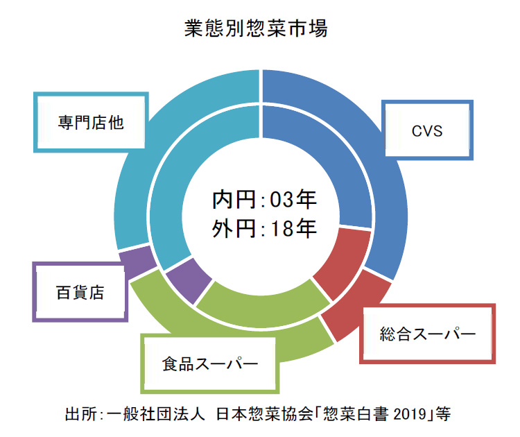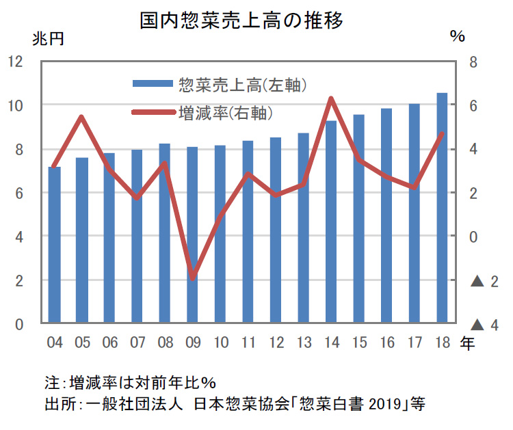 T:そうだね。日本惣菜協会の「惣菜白書2019」によると、2018年の国内惣菜売上高は前年比4.6%増の10兆5,218億円で、9年連続して前年を上回る成長となったそうだよ。また、業態別で見ると、コンビニや食品スーパーの需要増加が大きいようだね。