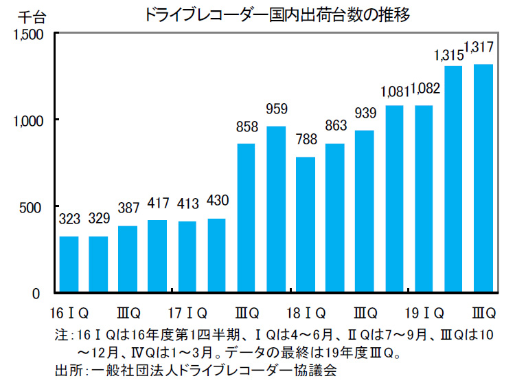 神様:その通りです。ドライブレコーダーの出荷については、現在右肩上がりで伸びています。特に、2017年6月の東名高速道路での一家4人の死傷事故が大きく報道されて以降、ドライブレコーダーへの需要が急増しました。2019年に入っても、需要はさらに伸びています。ドライブレコーダー協議会によると、2019年度の第3四半期の国内出荷台数は、前年同期比40%増の131.7万台となり、四半期ベースでは過去最高を記録しました。2019年度4月~12月では前年同期比43%増の371.4万台となり、2018年度の年間出荷台数367.1万台を9か月間で超えました。