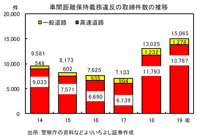 神様:警察による取り締まりも強化されています。警察庁では、高速道路や一般道路での摘発を強化し、危険運転につながる車間距離保持義務違反の取締件数は2018年に前年比83%増の1万3,025件へ急増しています。2019年も前年比16%増の1万5,065件と、増加が続いています。