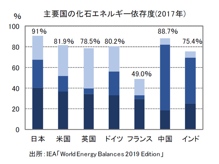 神様:いい視点です。先ほどの話に戻りますが、2017年の主要国の化石エネルギー依存度を見ると、日本が最も高く91%、続いて中国が88.7%です。フランスを除き各国70~80%台と高いのですが、その中でも日本が高いのです。