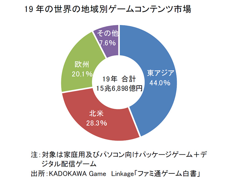 神様:「ファミ通ゲーム白書」によると、2019年の世界ゲームコンテンツ市場は前年比19%増の15兆6,898億円となりました。現在、ゲームコンテンツの主流はデジタル配信です。特に中国におけるモバイルゲームの急成長を背景に、東アジアで大きく伸びています。