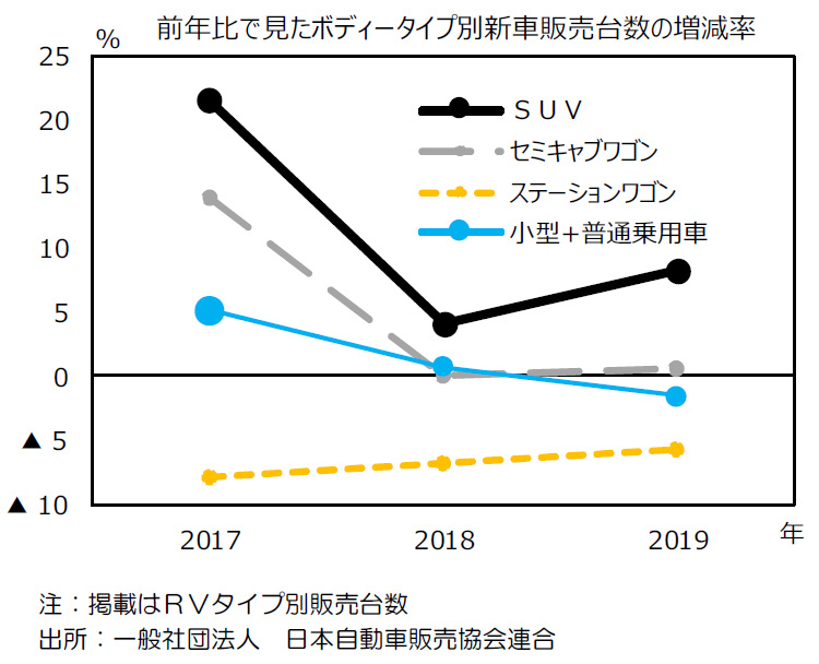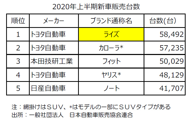 T:そう言えば、2020年上半期の新車販売台数の1位もSUVだったね。今年はトヨタや日産から新しいSUVも発売されたようだし、SUV人気はしばらく続きそうだね。新型コロナウイルスの影響もあって国内の自動車販売台数は伸び悩んでいるようだけど、SUVの販売は前年比でもプラスを維持しているようだし、新車販売のテコ入れにつながるかもしれないね。