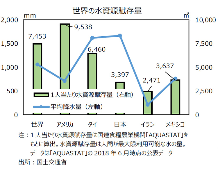 神様:まず、日本は国土のわりには人口が多いです。また、地形が急峻で河川の流路延長、言い換えれば河川の長さが短く、雨は梅雨の時期や台風シーズンに集中します。そのため、水資源賦存量のかなりの部分が水資源として利用されないまま海に流出してしまいます。日本は、水資源が豊富であるとは言えないのです。