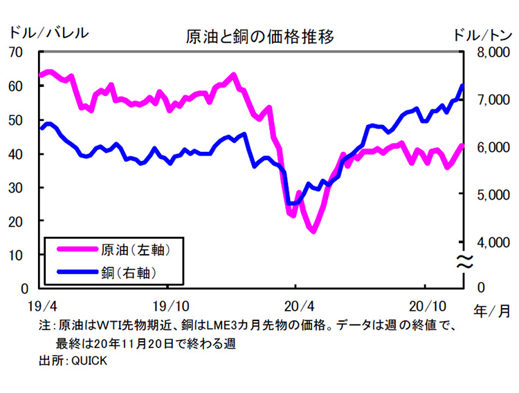 神様:経済活動が回復に向かっている例として、原油と銅の市況について見てみましょう。週の終値で見ると、原油ではWTI(ウエスト・テキサス・インターミディエート)の先物期近価格が4月には1月から73%も下落しました。しかし11月には1月の約70%まで回復しています。銅も同じように、LME(ロンドン金属取引所)の3か月先物価格が3月には1月から24%も下落しましたが、11月には下落前の水準を超えるところまで回復しました。