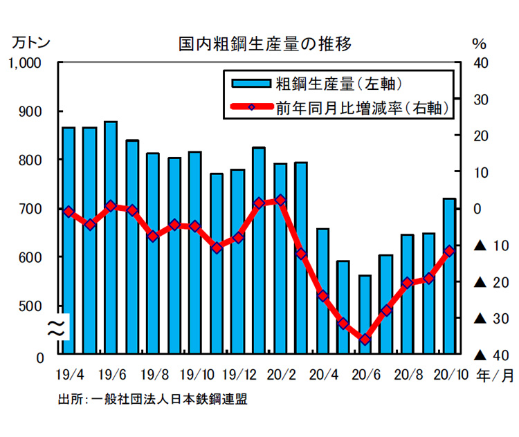 神様:経済活動と感染防止対策の両立で、この年末を何とか耐えたいところです。さて、国内でも、経済活動再開の影響が出ていますよ。日本鉄鋼連盟によれば、10月の国内粗鋼生産量は、前年同月比で11.7%減の720万トンでした。前年に比較すると減少が続いていますが、6月をピークに減少幅は縮小しています。これは、自動車や家電向けに需要が回復してきていることの影響でしょう。
