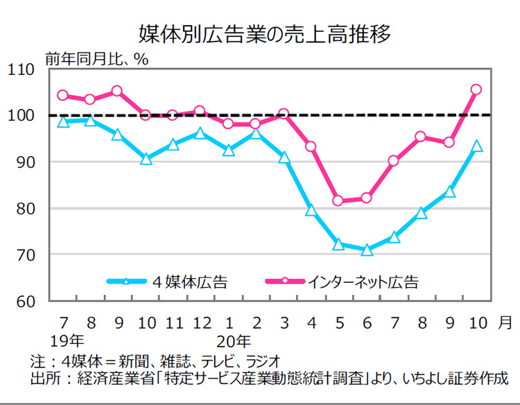 神様:媒体別広告業の売上高推移を見ても、広告売上全体が大きく落ち込んだことがわかります。一方でインターネット広告は、主要4媒体広告と比較して落ち込みが少なく、回復も早い傾向が見られました。