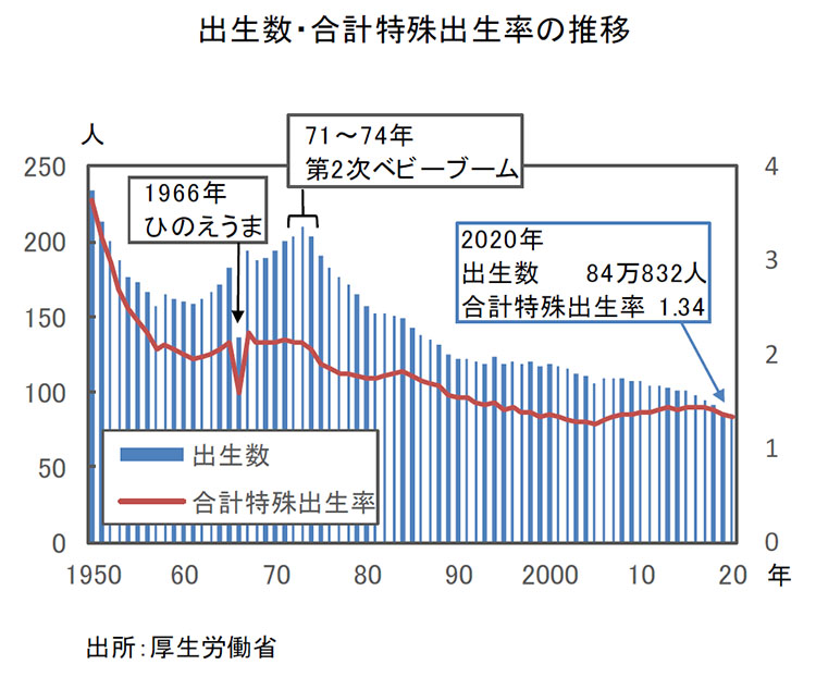 神様:コロナの影響もありますが、それだけではないでしょう。内閣府では過去に、日本の少子化の背景について言及し、なぜ少子化が深刻化しているのか?という問いに答えています。戦後の日本は経済成長による所得水準の向上などにより、豊かな生活環境が整いました。多産多死から少産少死へ人口転換が進み、第一次ベビーブーム、第二次ベビーブームを経て人口の自然増加率をゼロとする静止人口を目指す考え方が普及し、出生数が減少し続けるようになりました。一方で1980年以降では、デフレが慢性化し、不安定な低賃金の非正規雇用者の増加などが未婚化を促進しています。さらに、女性の就業率の高まりや結婚・出産の機会費用の増大、結婚・出産に対する価値観の変化などもあり、非婚化・晩婚化・晩産化が進んでいるのが現状です。