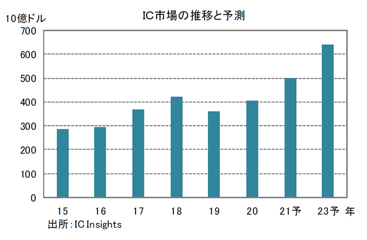 神様:その通り、大正解です。IC市場も大きく伸びています。米国調査会社IC Insightsによると、IC市場規模の見通しについて、2021年は前年比で24%増の5,020億ドルと史上初の5,000億ドル突破を見込んでいます。さらに、2023年には6,000億ドル超になると予想しています。
