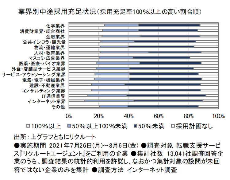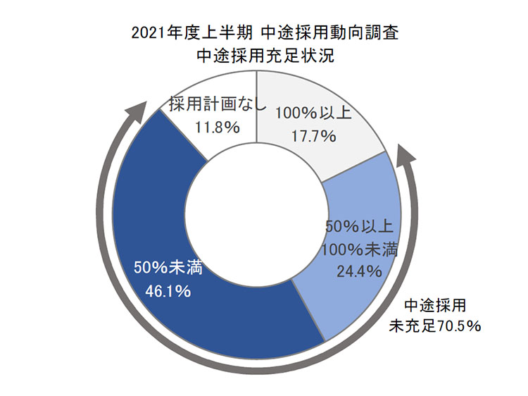 神様:リクルートが10月5日に発表した「2021年度上半期 中途採用動向調査」によると、中途採用充足率が100%以上である企業は全体の17.7%でした。一方で採用未充足だった企業は70.5%で、そのうち、採用充足率が50%未満の企業は46.1%を占めました。