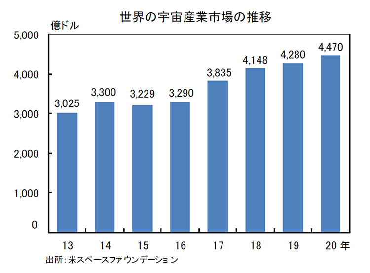 神様:宇宙関連団体の米スペースファウンデーションの発表によると、2020年における世界の宇宙産業市場規模は前年比で4.4%増の4,470億ドル、日本円では約50兆円に拡大しました。衛星産業を中心に、安定した成長を続けています。