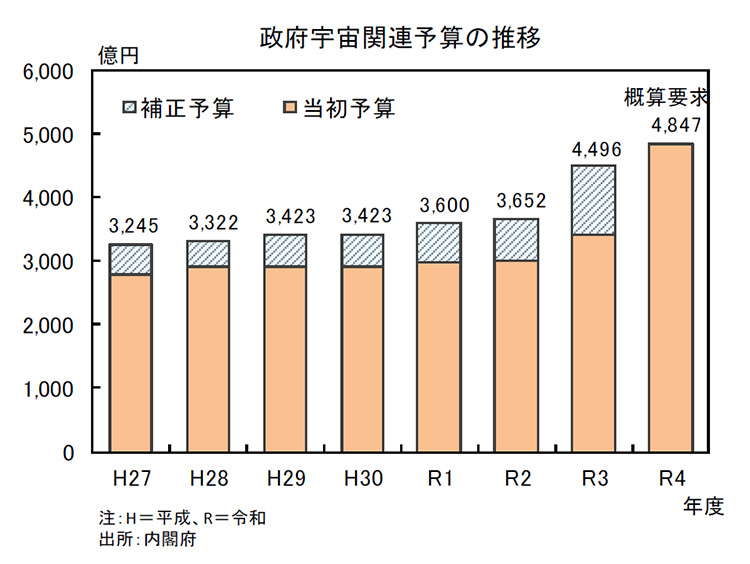 神様:それらの宇宙利用サービスの創造により、宇宙産業の裾野が広がってきています。政府も、2020年6月、今後20年を見据えた10年間の国の宇宙政策の基本方針「宇宙基本計画」を改訂しました。基本計画では、宇宙安全保障の確保、災害対策、国際宇宙探査、民間企業の参画などを目標に、具体的に取り組む内容が盛り込まれました。さらに政府予算も増額の流れにあります。令和4年度予算の概算要求における宇宙関連予算は4,847億円となり、前年度当初比で42%の増額となりました。