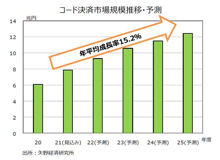 神様:矢野経済研究所によると、2020年度のコード決済市場は6兆1,216億円と推計されています。2025年度には12兆3,976億円まで拡大すると予測しており、今後も年率15.2%の成長が見込まれています。背景には、コロナ禍でのタッチレス・非接触需要の高まりがあります。コロナ禍も市場の成長を加速させていると言えるでしょう。