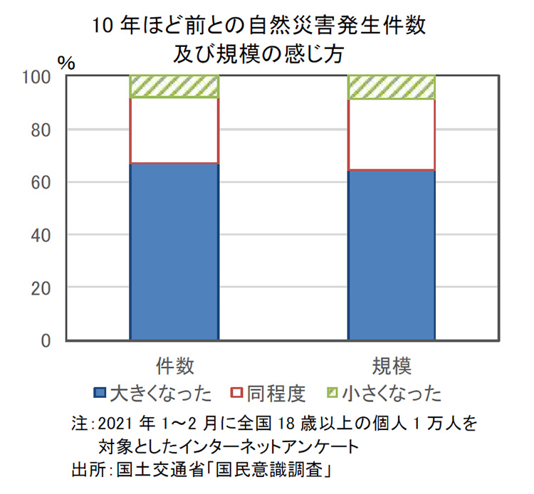 神様:こんな調査があります。国土交通省の調べによると、2019年に氾濫危険水位を超過した河川は2014年の約5倍でした。また、2010年から2019年でみた50㎜/h以上の短時間強雨の年間発生件数は、1976年から1985年に対して約1.4倍に増加しました。さらに、2021年1月・2月に全国の18歳以上の1万人を対象にアンケートを実施したところ、10年ほど前との自然災害発生件数や規模の感じ方について「大きくなった」と回答した人が件数・規模のどちらについても60%を超えました。