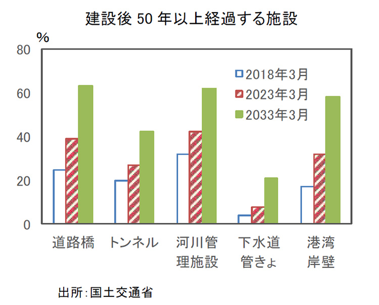 神様:その通りです。自然災害の発生を予測することは難しいです。しかし、事前の防災・減災対策に取り組むことは可能です。今後はこの点がより大切になってきます。特に、これからは建設から50年以上が経過する施設が加速度的に増加する見込みです。道路、橋、トンネル、河川の管理施設、下水道の管きょ、港湾など、老朽化が進む各種の社会資本をメンテナンスしていく必要があるでしょう。