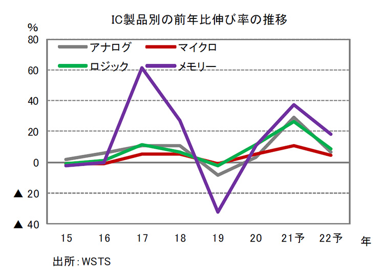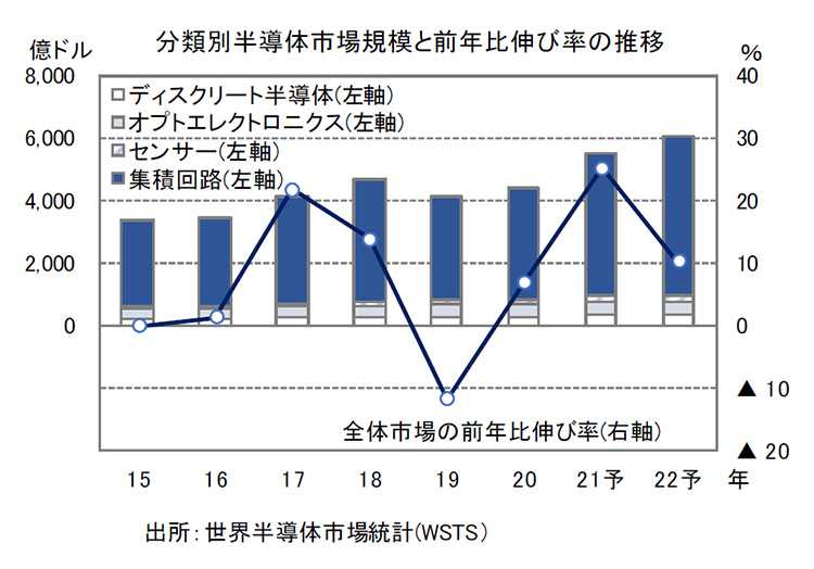 神様:そうですね。日米のほか欧州も、半導体の自国製造拠点の誘致に多額の補助金を出しています。世界各国が半導体などの“戦略的物資“の確保や重要技術の獲得にしのぎを削っている状況です。世界半導体市場統計(WSTS)は今年8月、6月に公表した半導体市場の売上額見通しを上方修正しました。半導体の約8割を占める集積回路(IC)での全製品の伸び率は、今年大きく伸びるだけでなく、来期も堅調な伸長が予想されます。市場の動向からはまだまだ目が離せません。