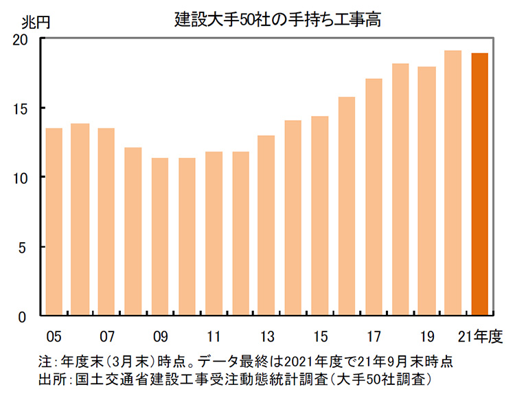 神様:しかし、建設大手50社の2021年9月末時点の手持ち工事高が2020年9月末比で10.4%増の18兆8,819億円です。手持ち工事量の解消に必要な期間を表す、手持ち工事月数も高水準な状況です。建設会社にとっては、高水準の手持ち工事高を背景に業績の向上が期待できると思います。