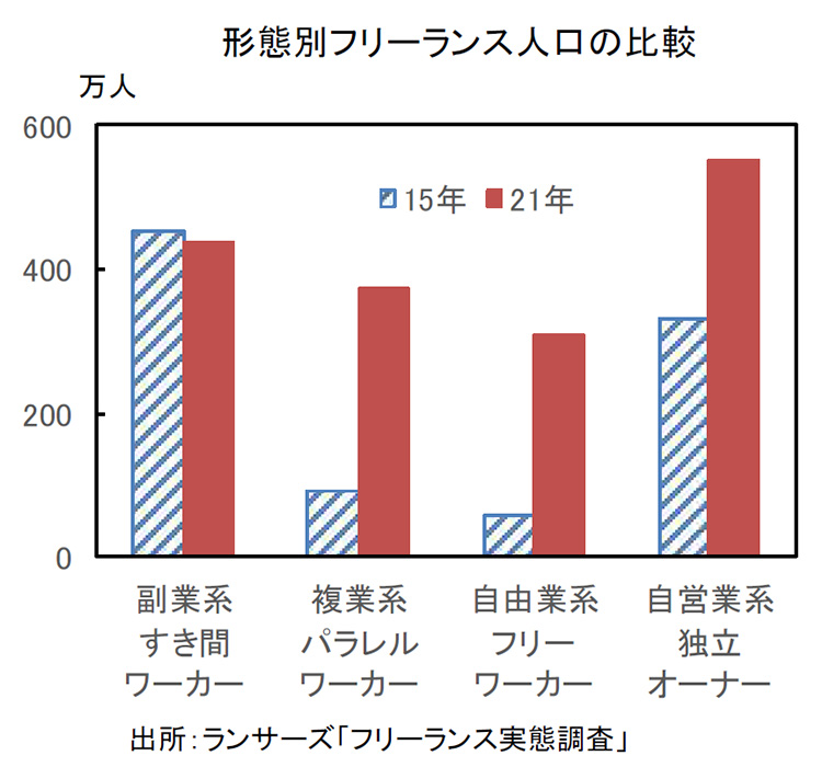 神様:「副業系」は2015年時点でフリーランス人口の第1位でしたが、2021年には「自営業独立系」に1位の座を明け渡しました。2015年調査時と2021年調査時のフリーランス人口を比べてみると、4つのタイプの中で大幅に増加しているのは「複業系パラレルワーカー」と「自由業系フリーワーカー」であることがわかります。これは、コロナ禍を経てのリモートワークの定着や働き方改革の推進に伴い自分に合った自由な働き方ができるフリーランスの長所が注目されたことによる結果と考えられます。