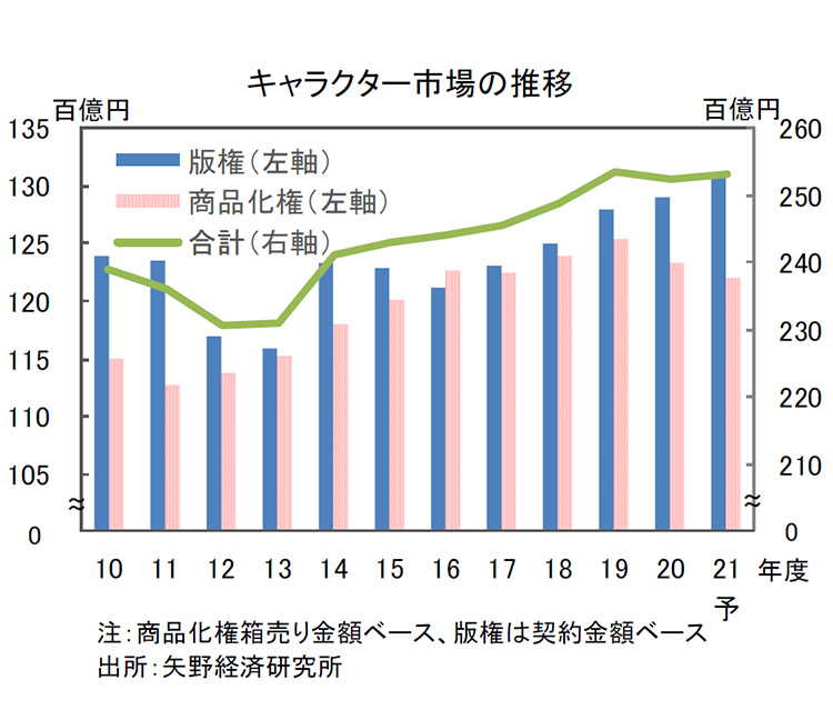 神様:そして今も、人気者として市場を賑わせています。いわゆる「キャラクタービジネス」は、息の長いビジネスを展開することができます。日本では様々なキャラクターが日々創造されていますが、アニメーションや実写などで海外では大変高く評価されています。まさに、日本のお家芸と言えるでしょう。実はここ10年近く、キャラクタービジネスは出版権や商品化権などのキャラクター版権市場が右肩上がりで伸び続けているのです。