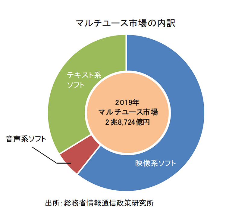神様:総務省によると、2019年の日本国内のコンテンツ1次流通市場は9兆829億円でした。コンテンツは、映像系ソフト、音声系ソフト、テキスト系ソフトに大別されます。これらのコンテンツが単体だけでなく、複数のメディアで転用され、ひとつの素材が複数の使い方をされる「マルチユース市場」を生み出すのです。