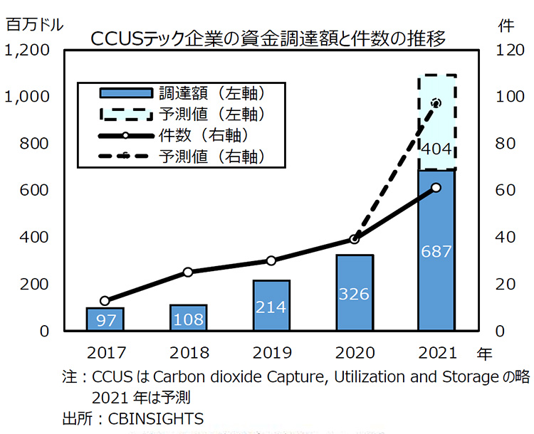 神様:はい。具体的には、ポリカーボネート等の樹脂、エタノールやメタン等の燃料、コンクリート製品等の鉱物を抽出・製造する際に、CO2を利用することが考えられています。この分野は急速に伸びており、2021年のCCUSテック企業の資金調達額を見ると、前年比で3倍の11億ドルの見込みです。今後はさらに注目度が増すでしょう。